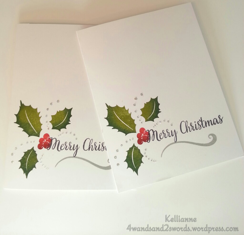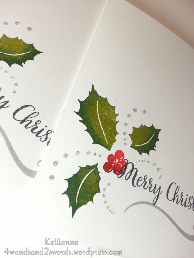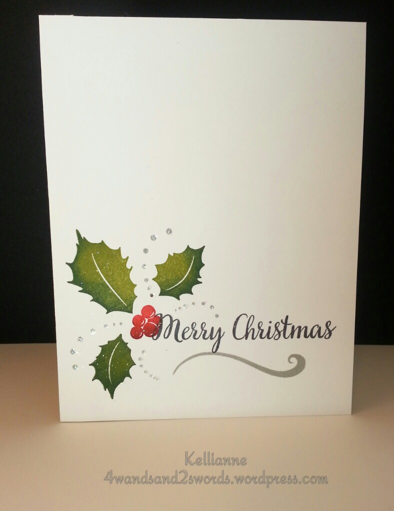 I love this set from The Ton that came in my Stamp of Approval box last year. It’s got beautiful images to add a nice touch to any card, like these dots in between the holly leaves. Added a little glitter to give some sparkle and the card was complete!