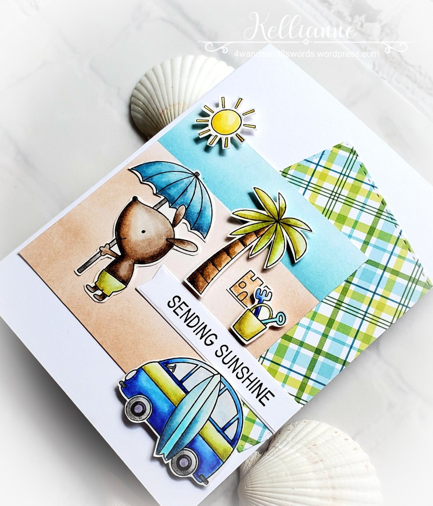 I used Zig Clean Color markers to color everything, as well as a bit of ink blending for the sand and sea. Thing 3 wants to see a mode of transportation on your card! Isn’t that little van with the surf board propped against it so so cute?!