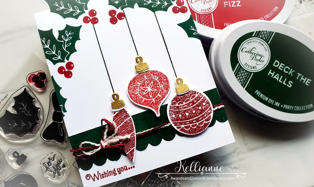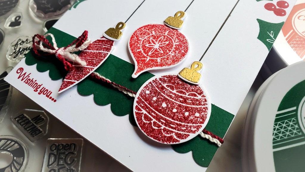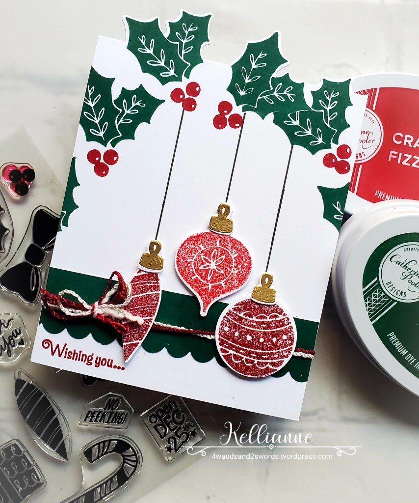 What a great Christmas card with the leaves off the top of the card. The shimmer is perfect on the ornaments.