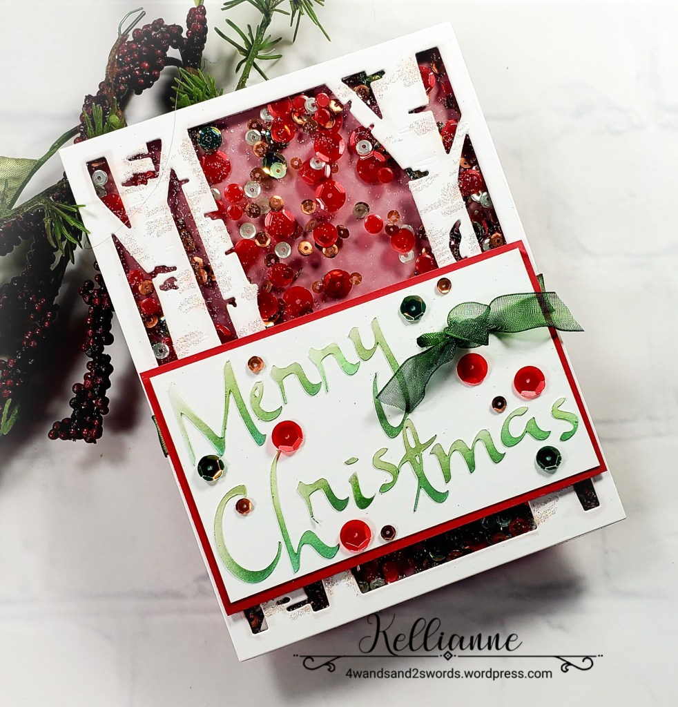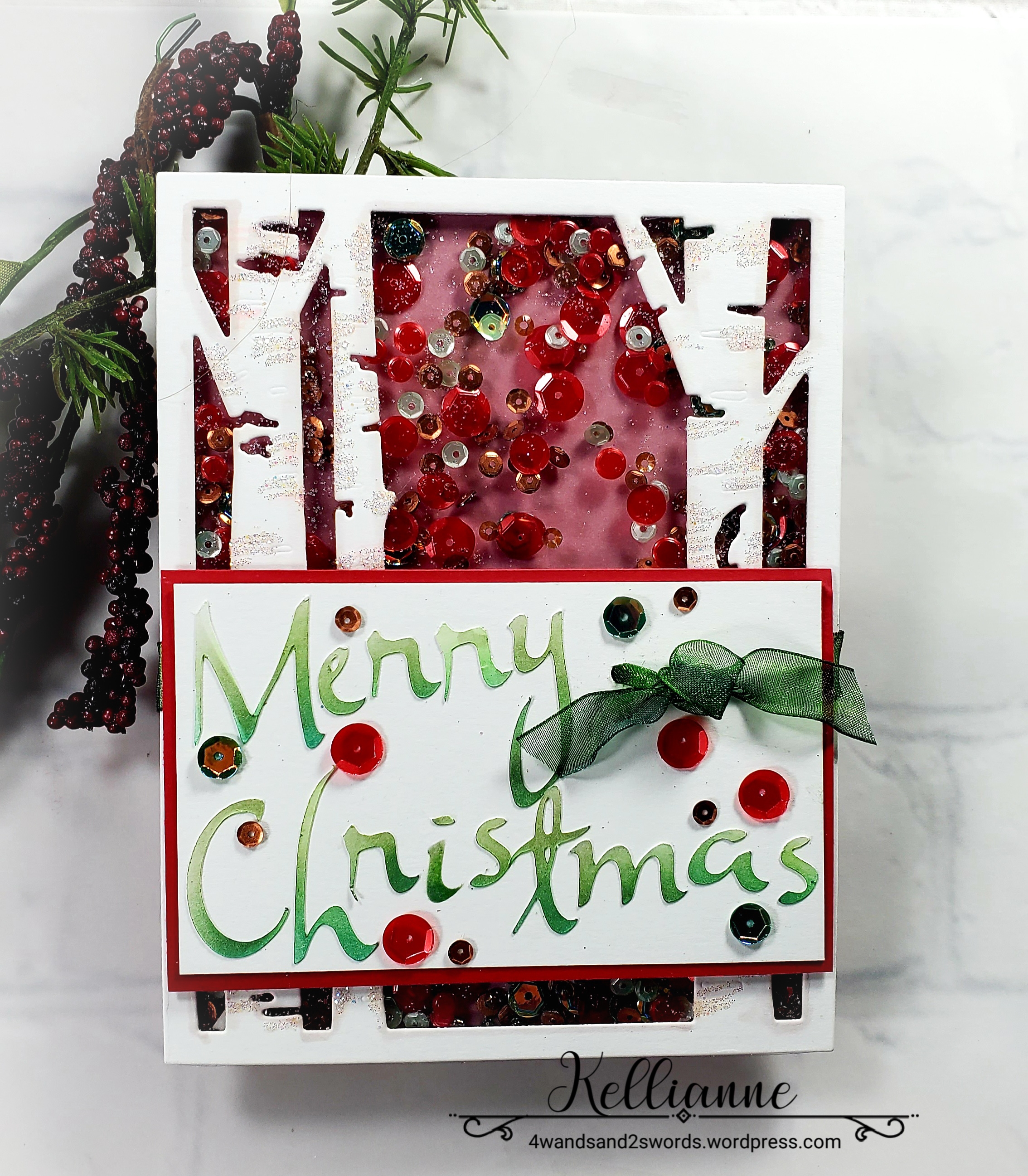 I was in the mood to make a shaker and I love my new birch trees die by Catherine Pooler. And Thing 1 is wanting to see a die cute! So I cut it and glittered it up and made it the front of the shaker