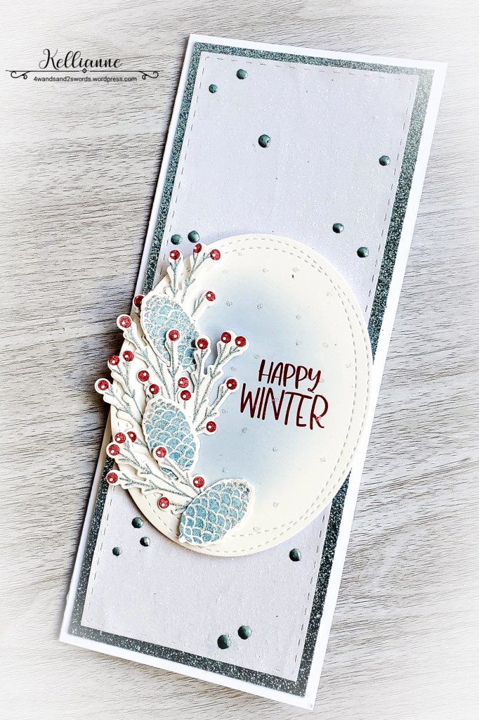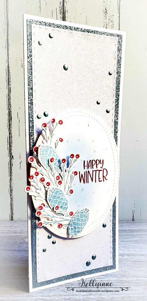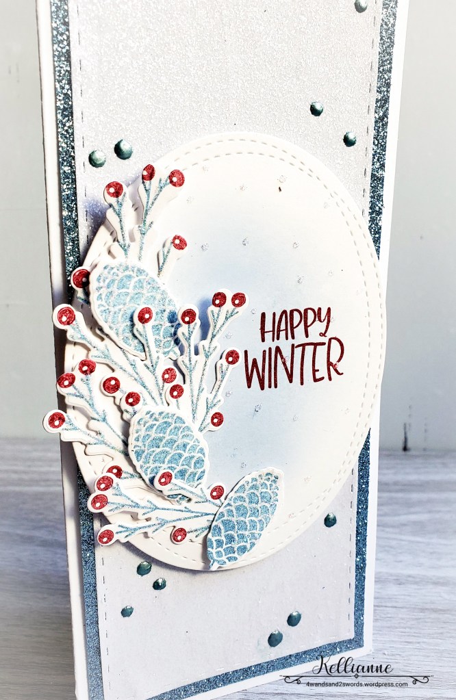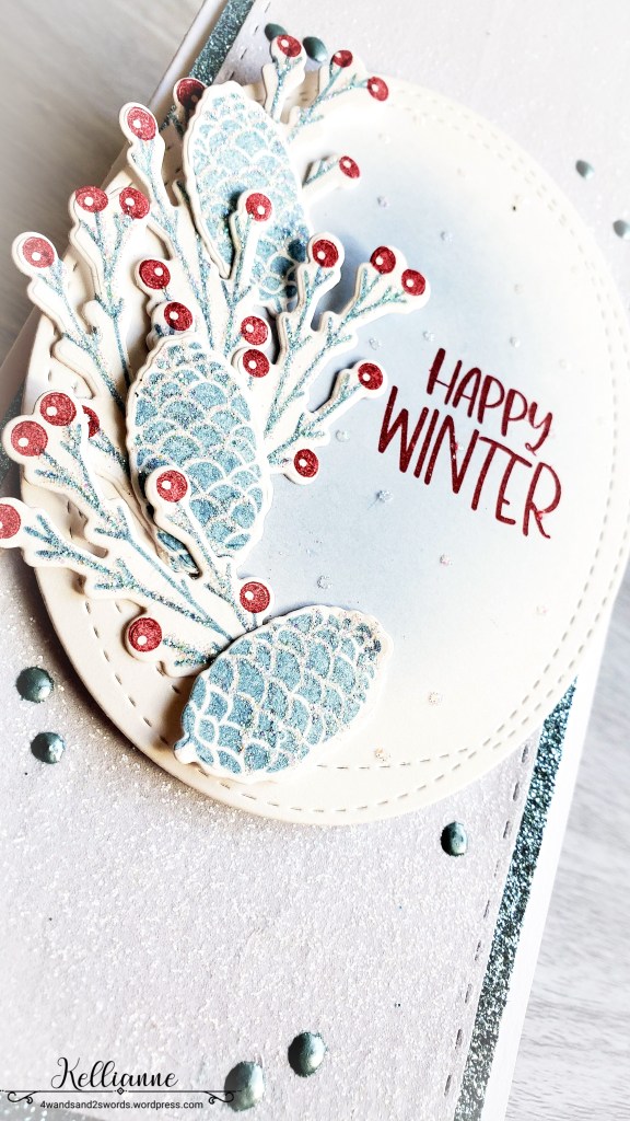 I used the “Lets Go Skating” stamps by Catherine Pooler. I love these winter branches with berries as well as the wintry pinecones. And of course everything is glittery glittery!