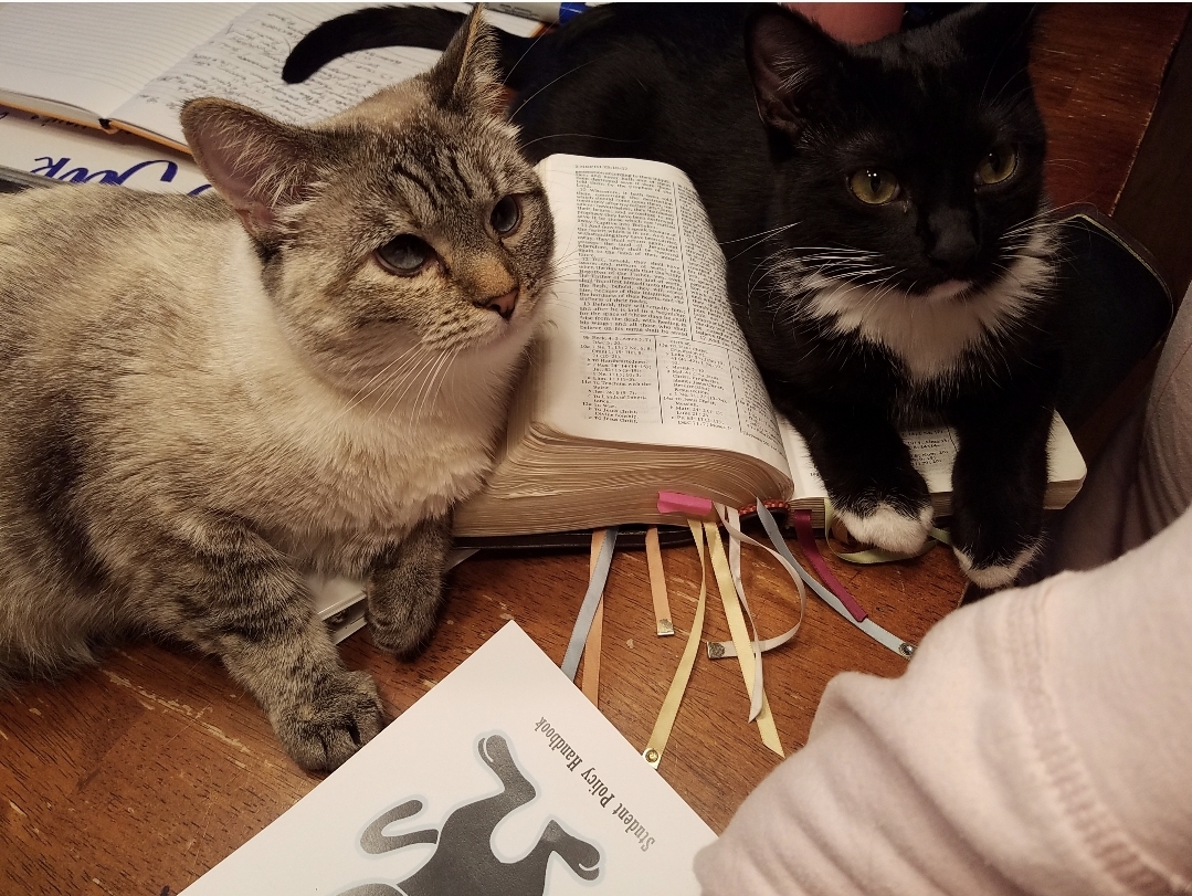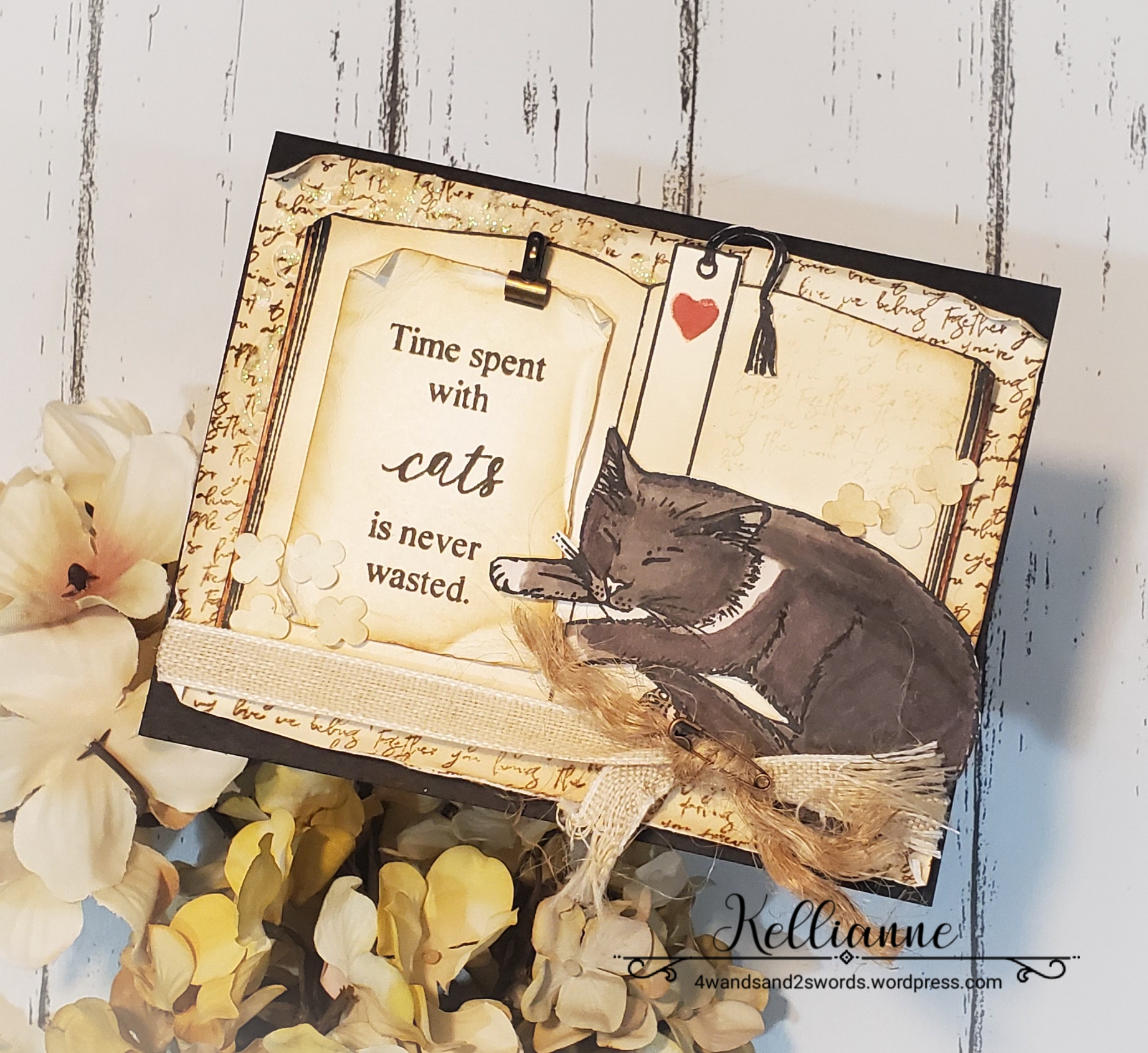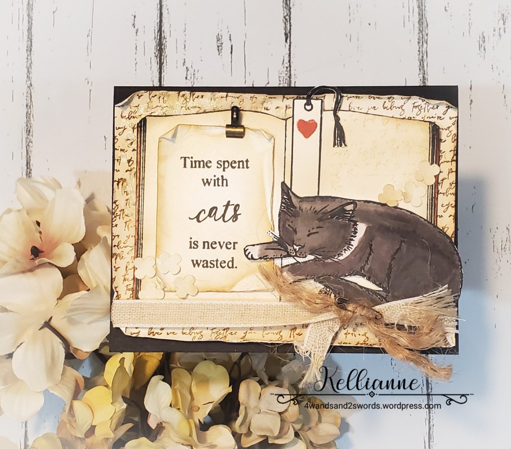 My card for this challenge was made in memory of my cat, Kimchi. He passed away less than one week ago. He got a really bad infection and declined faster than we ever thought possible. He was such a little buddy to me and loved being with me at my stamp table and when I would study scriptures. In fact, he liked to be right on top of both! Here’s a cute pic of him right on my scriptures with his sister, Kiko. (Kimchi is the black cat on the right)