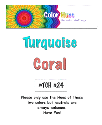 What a wonderful card! I love all the layers and you’ve combined the turquoise and coral beautifully! Thanks for joining us at Color Hues!