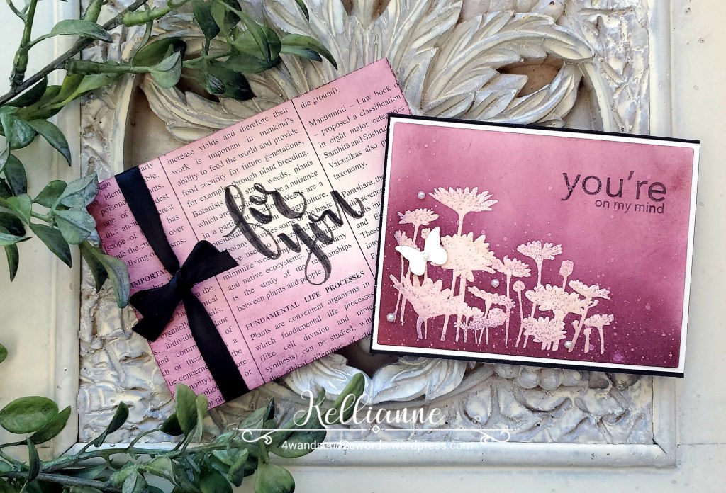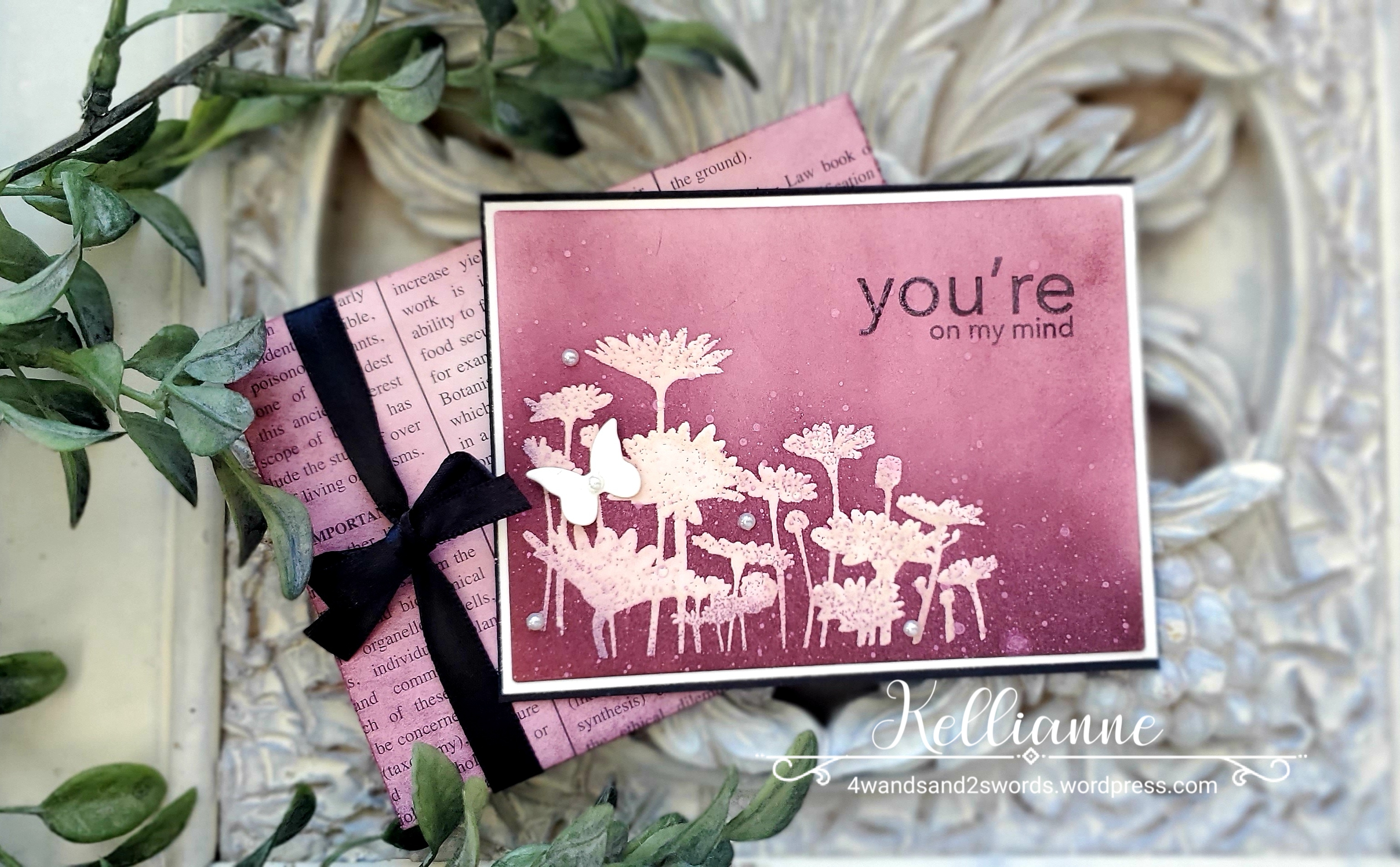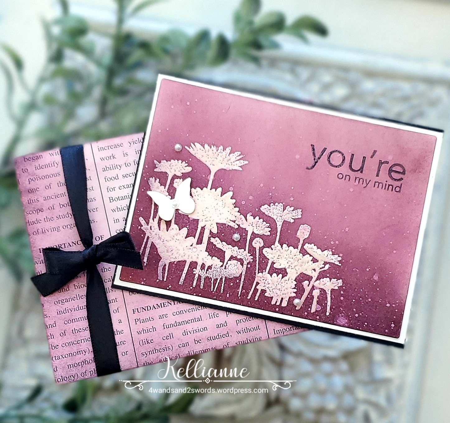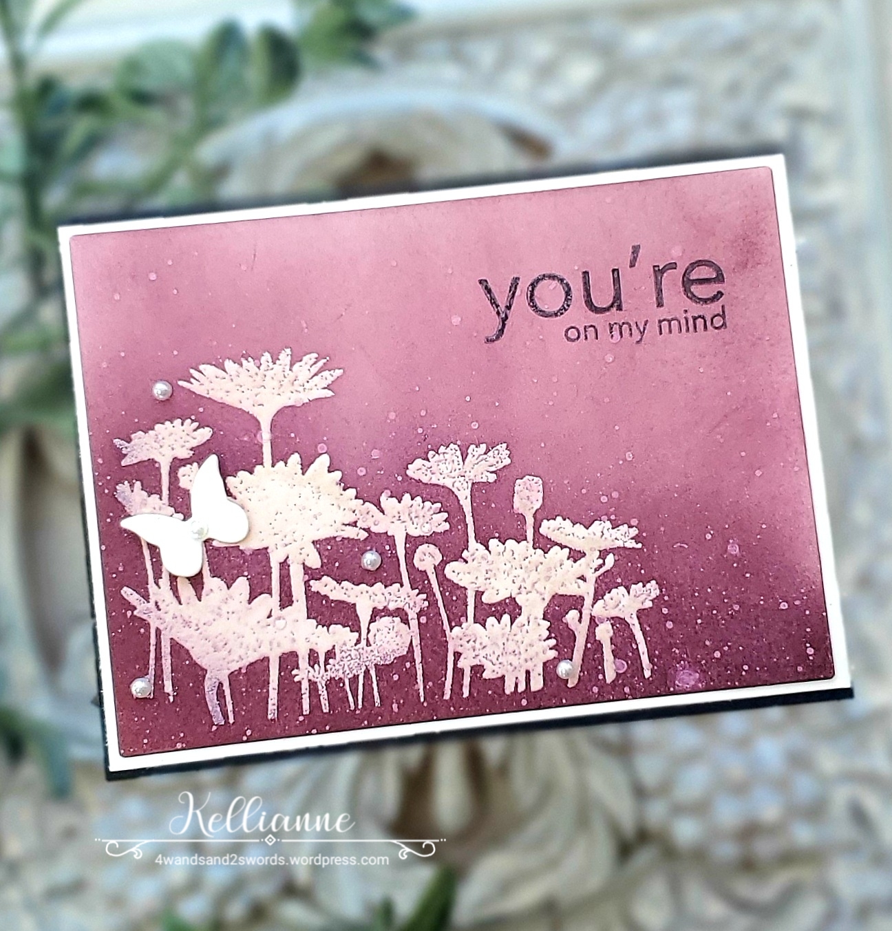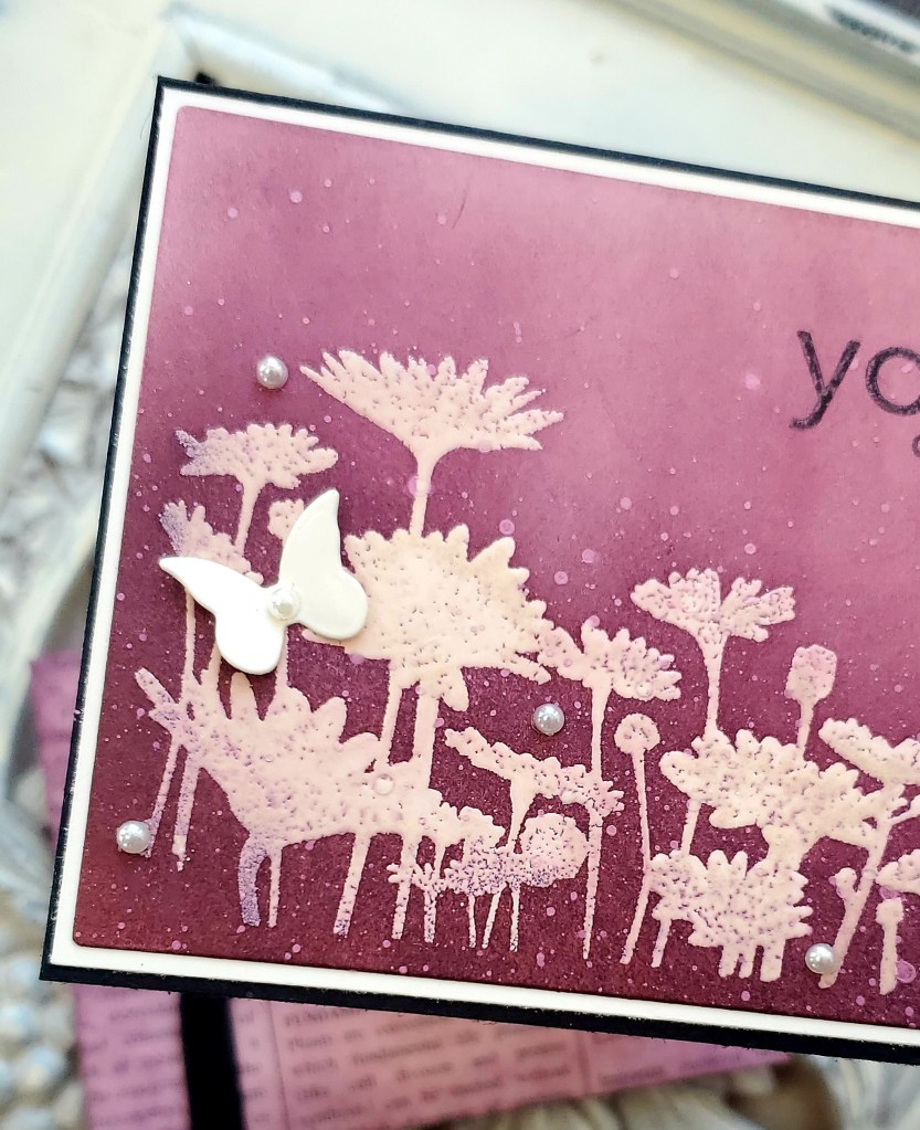 I used a VERY old set called “Upsy Daisy” by Stampin’ Up! I wanted to refresh it with some new style. I did some ink blending and splattering over an embossed image of those cute daisy silhouettes. I believe this set is from 2009. Wow! 12 years old and a darling card can still come from it!