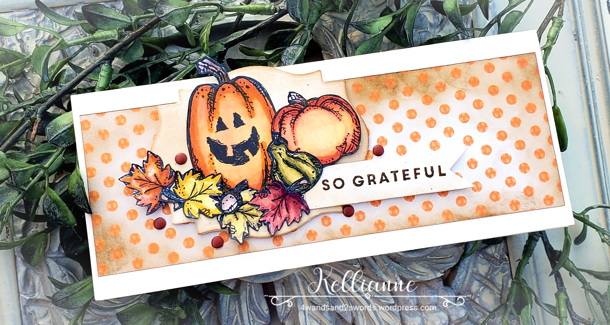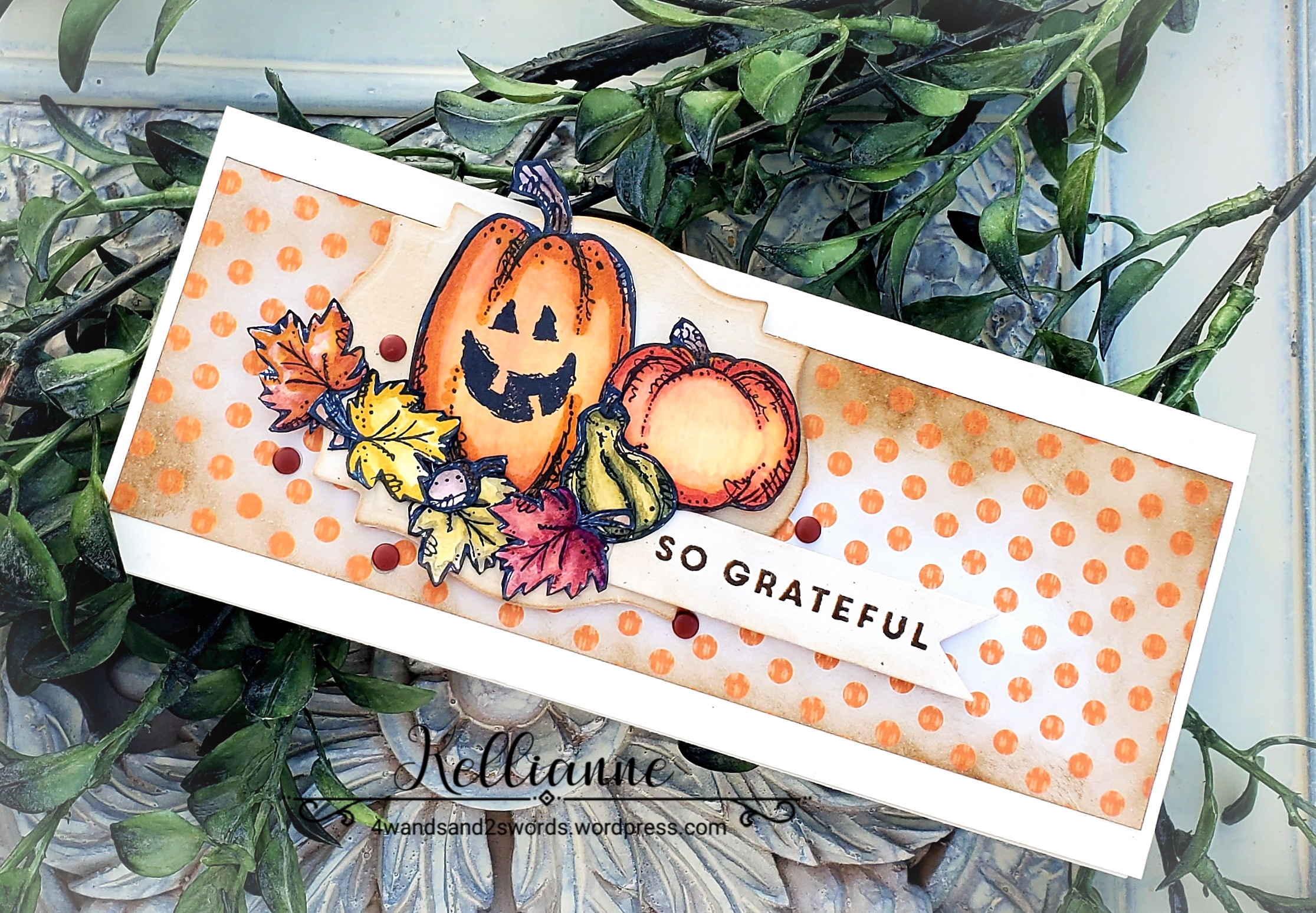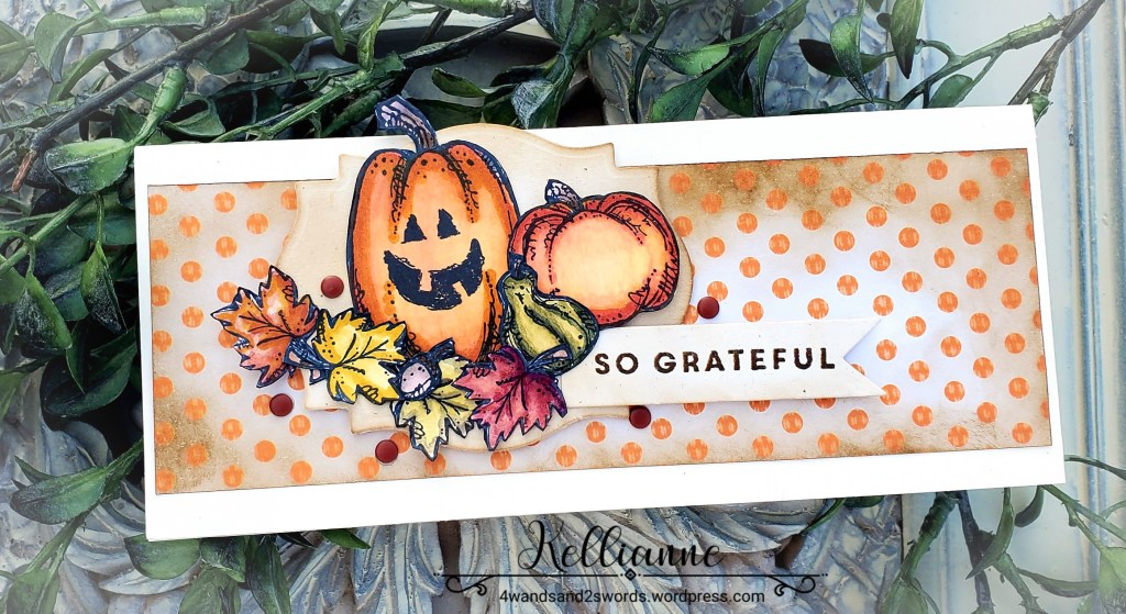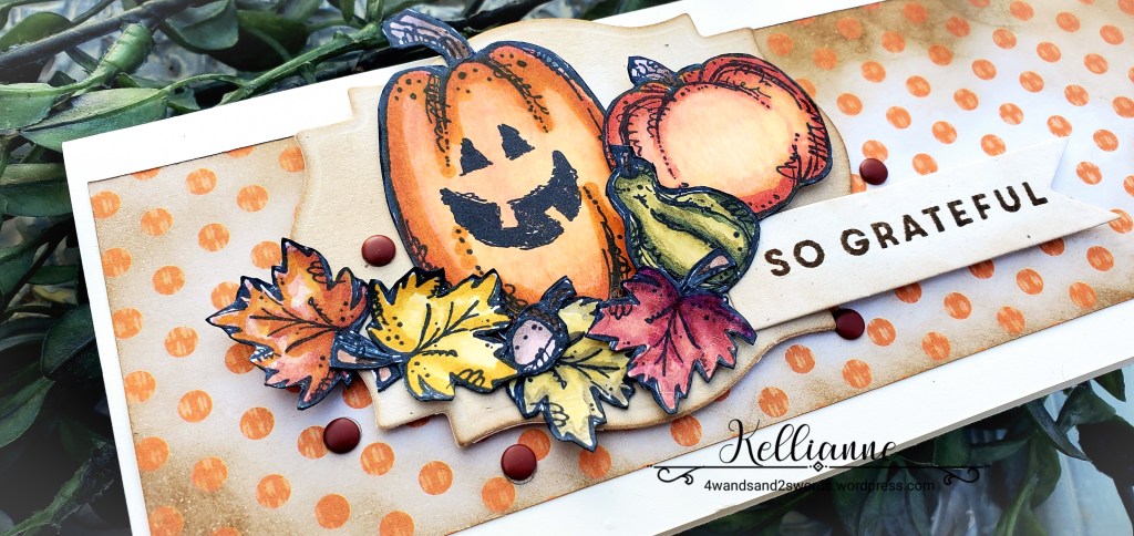 Great array of pumpkins, Kellianne! Love the fall colors and the background on your slimline card.