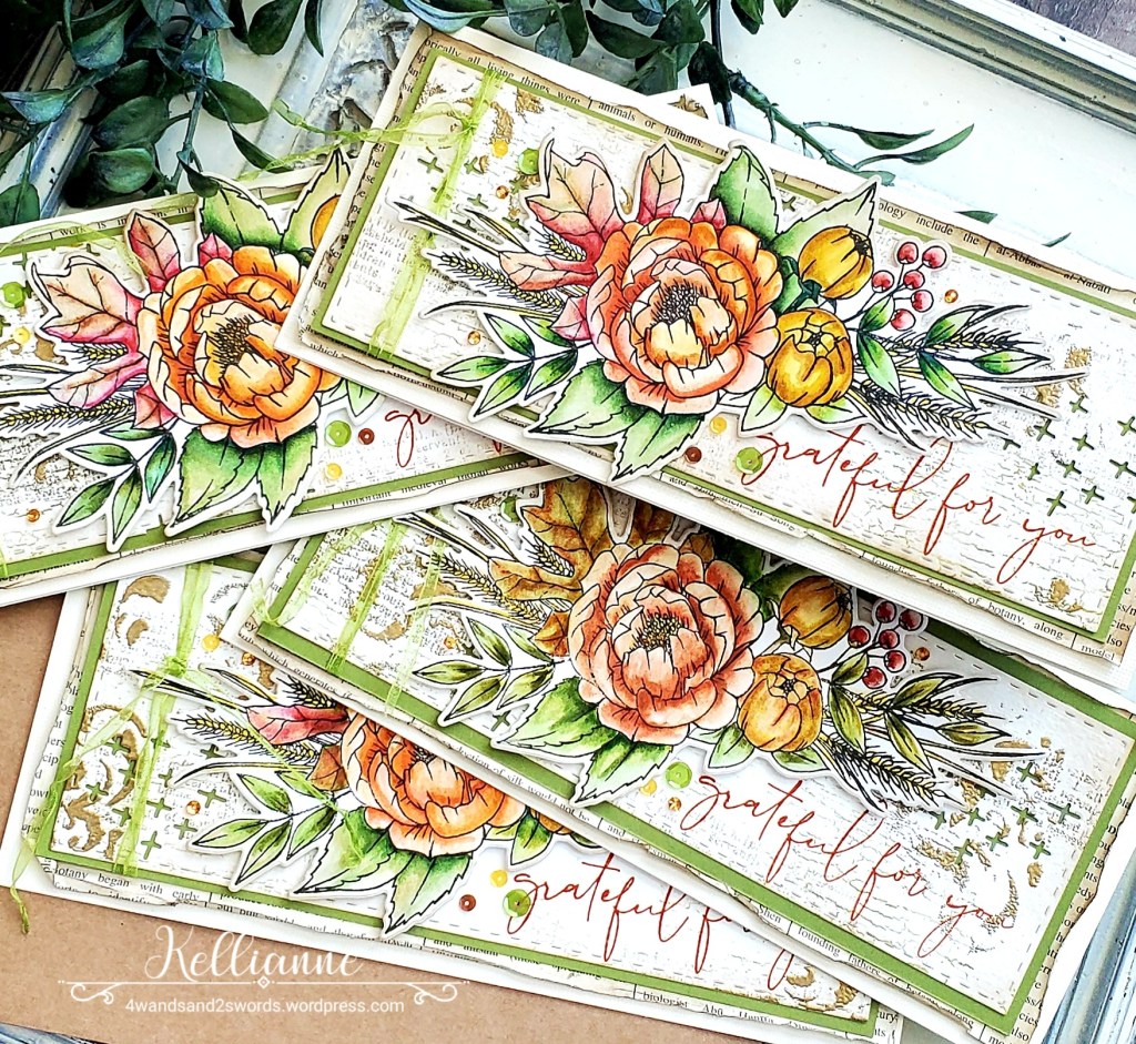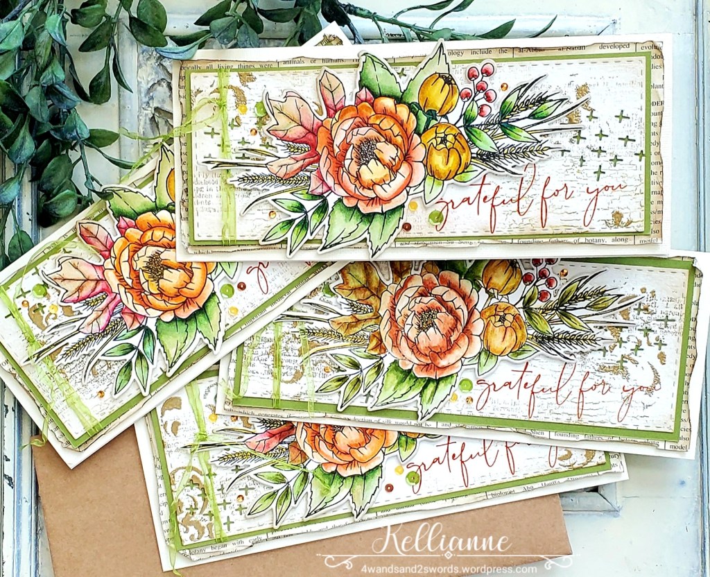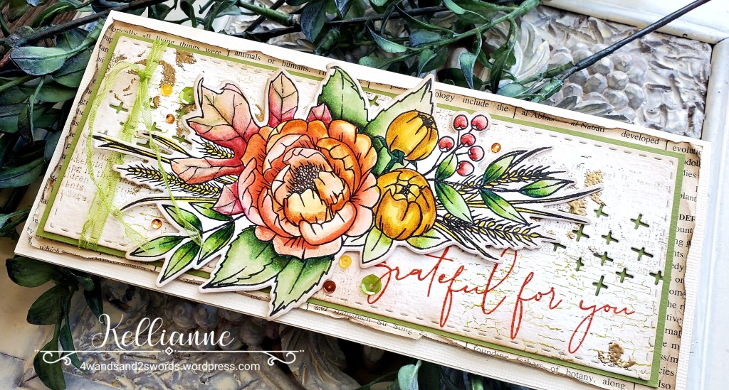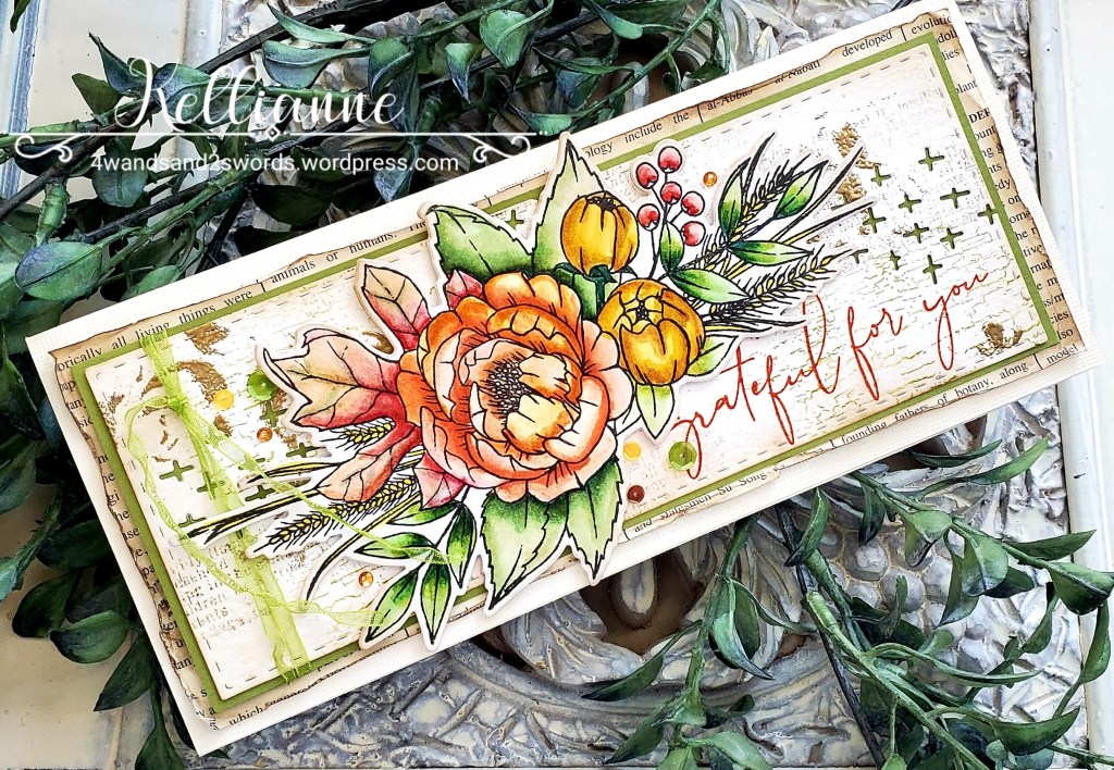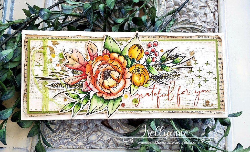 The main image and it’s coordinating dies are from a set called “Grateful for Everything” by Concord and 9th. This stamp is just so pretty for Autumn time and so much fun to color! I used Zig Clean Color markers this time around