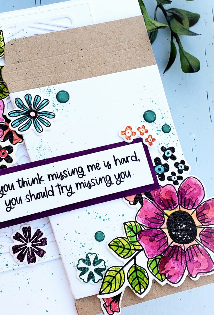 That cute big to-go cup is an awesome die by Catherine Pooler called “Gift Card To Go” The wrap around is designed to slide off, revealing a gift card that there is slots for. But I didn’t put a gift card in this time. I glue the wrap to the cup and added all the fun floral images