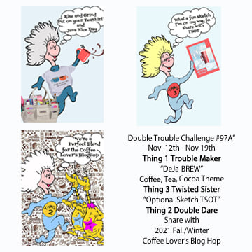 Thank you for stopping by to see my card! There’s so much fun going on with this challenge and the other challenges to join up with. Pull out all of your Coffee, Tea, and Cocoa images and dies and come share them with us at Double Trouble, as well as our friends!