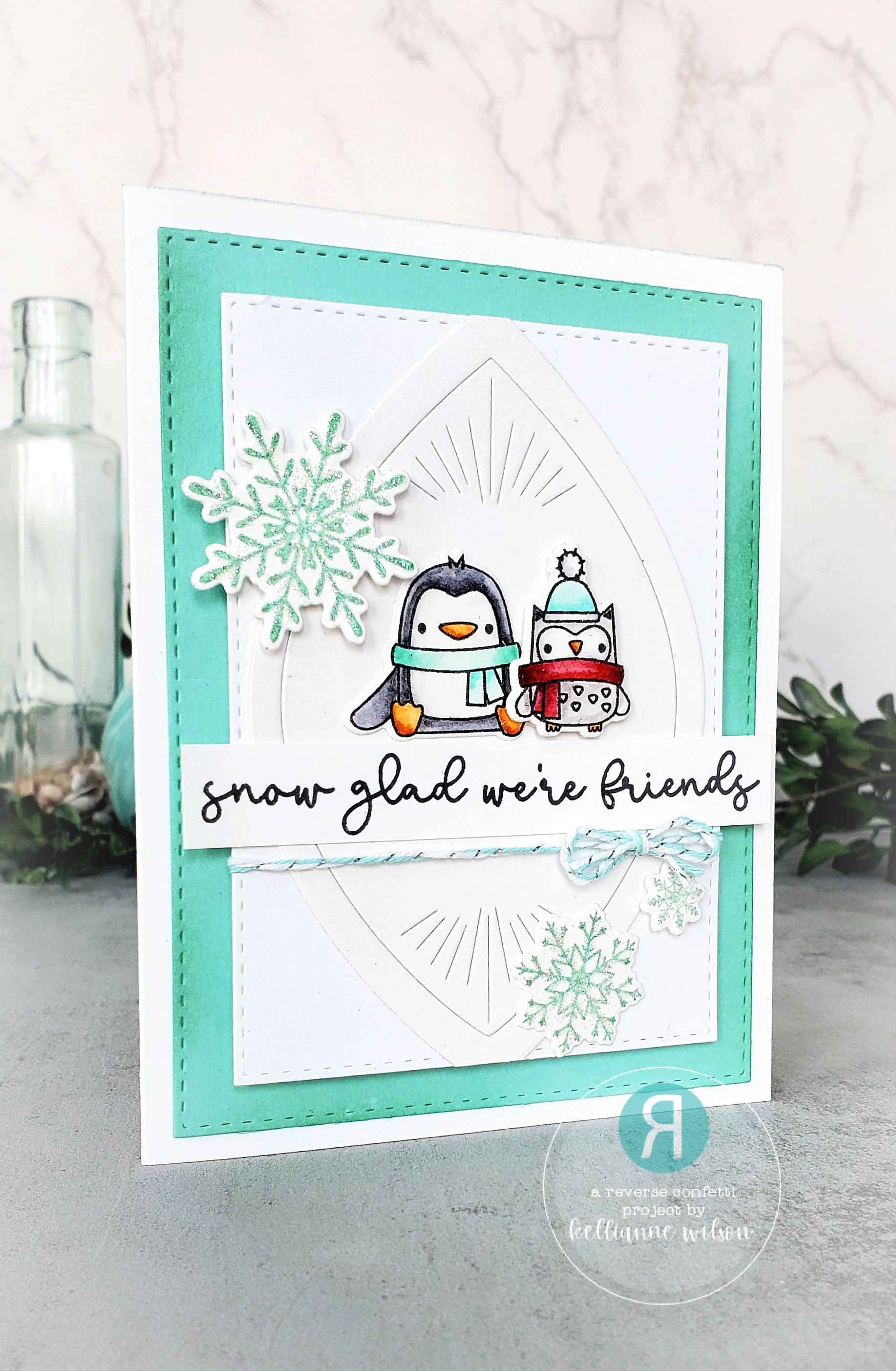 My card today uses the Open Drop Cover Panel Confetti Cuts, Polar Party stamps and dies, Snowflake Season stamps and dies, and the Snowy Sentiments set.