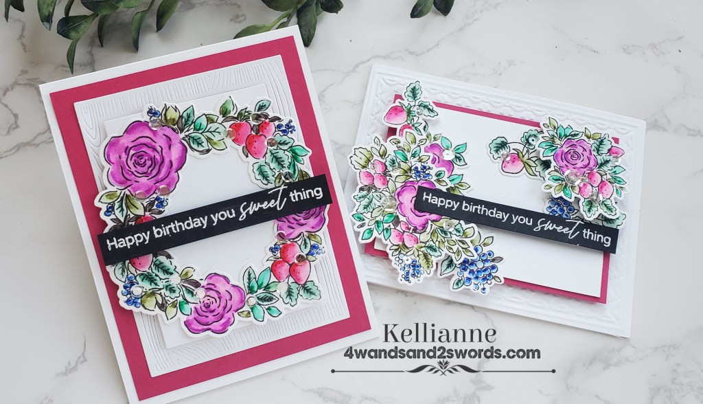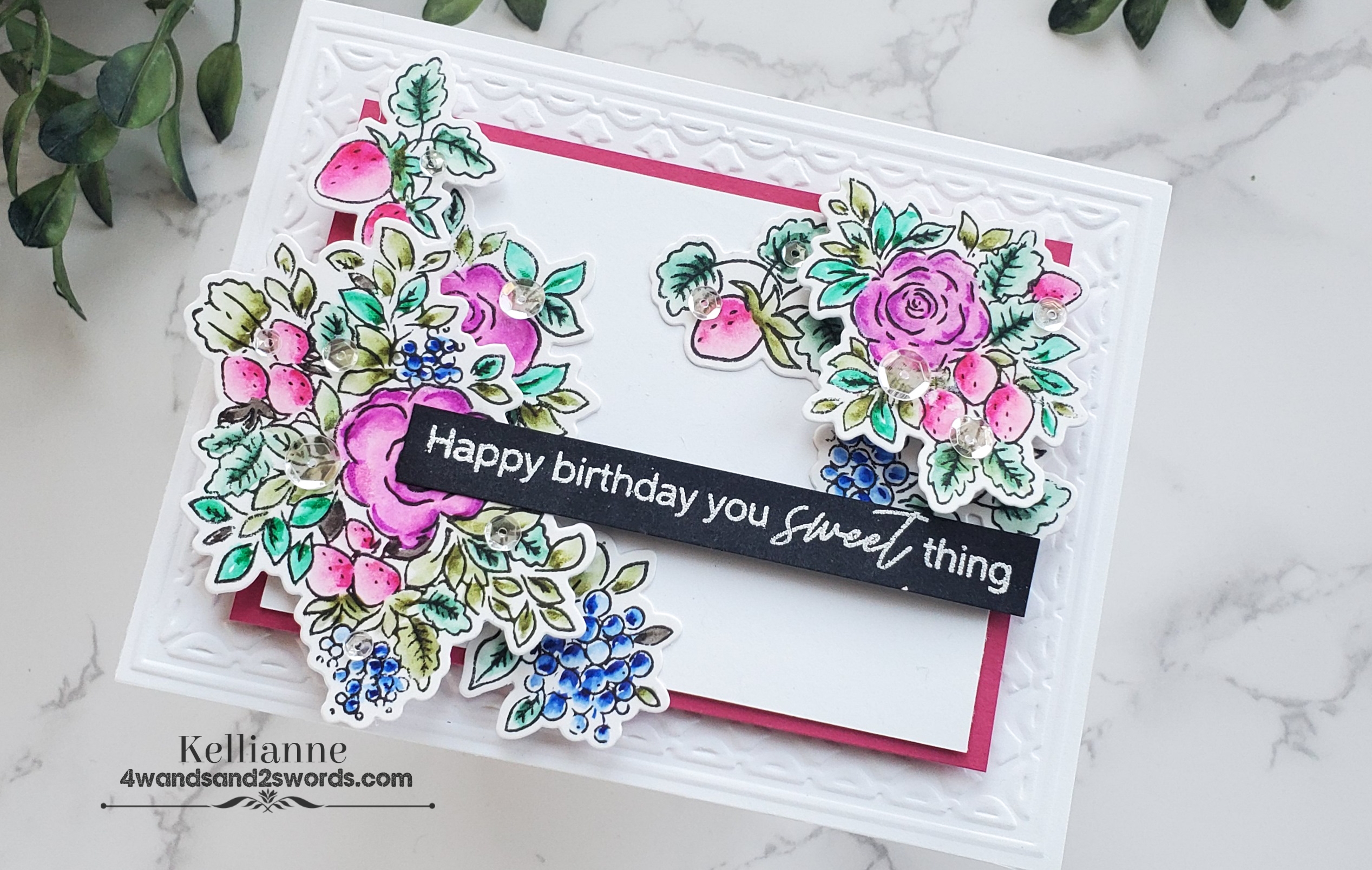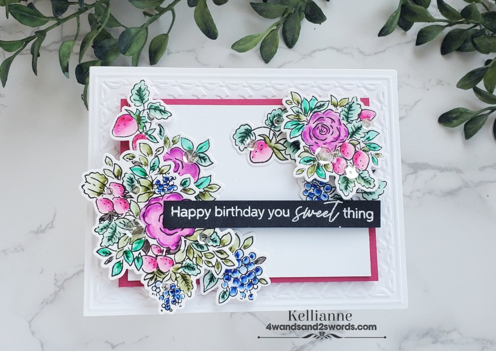 I used the amazing set by Pink Fresh Studio called Blossoms and Berries. It’s so incredible! It’s one huge long clear stamp with lots of images on it. And then the coordinating die is one big thing that cuts them all out at once! I absolutely love it. And because you get so many images out of one pass through the die cut machine, there’s plenty to make 2 cards, which is what I did today here.