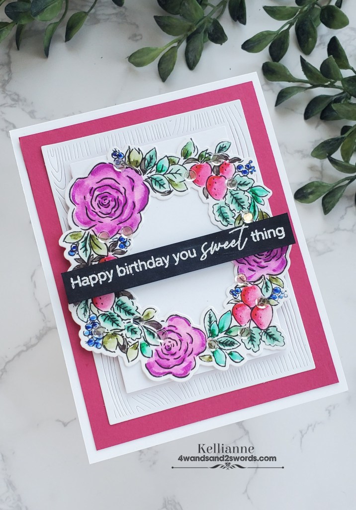 I actually loved the way this rosy red and lighter purple look together! I may possibly even feel like maybe I could try the deeper shades of both after having done these cards! I love the wreath card but I think the first one is my favorite with the florals in the corners