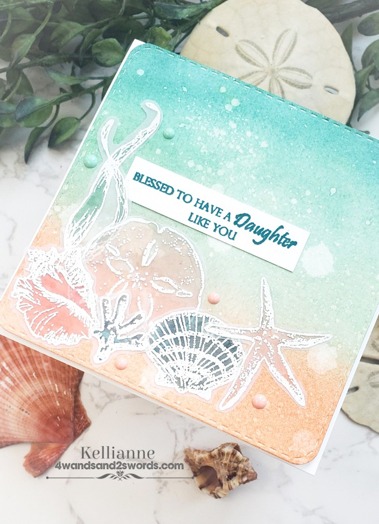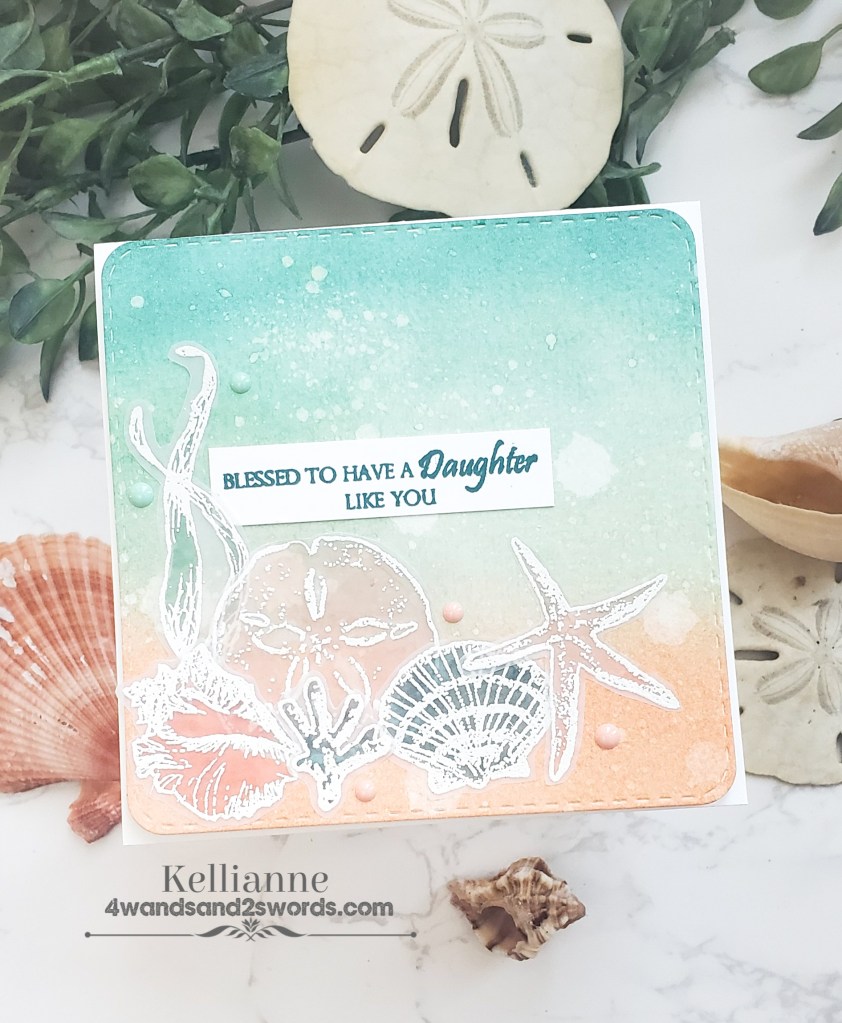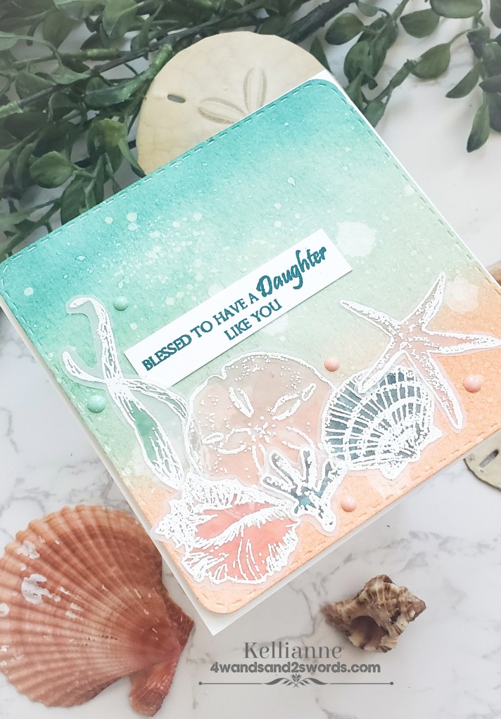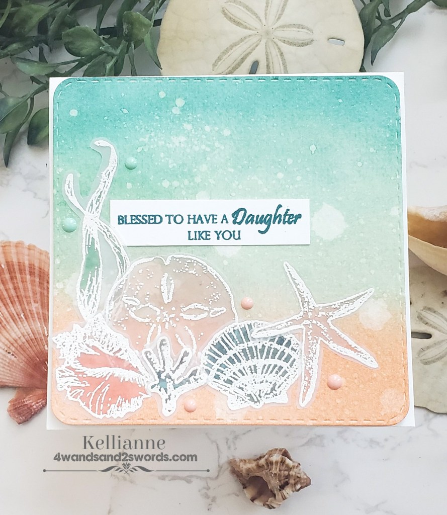 I haven’t played with the Gina K monthly challenge in a long time. Well I needed a card for my sweet daughter who just hit her one year mark on her mission! So I pulled out this beautiful seashell set by Gina K and got crafty