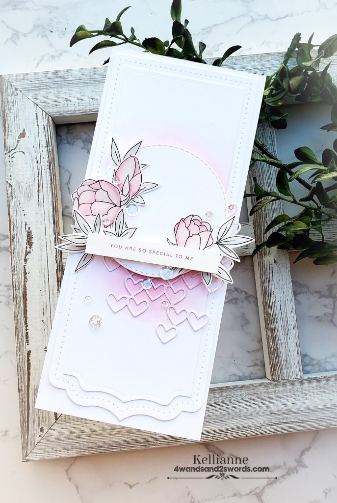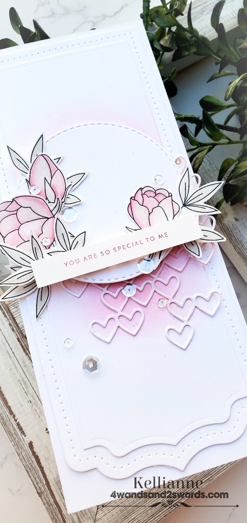 I wish you could see the beautiful Wink of Stella pen that I added to the flowers and the hearts die. It glimmers so pretty! The lighting just didn’t catch it though. The recipient will love it though!