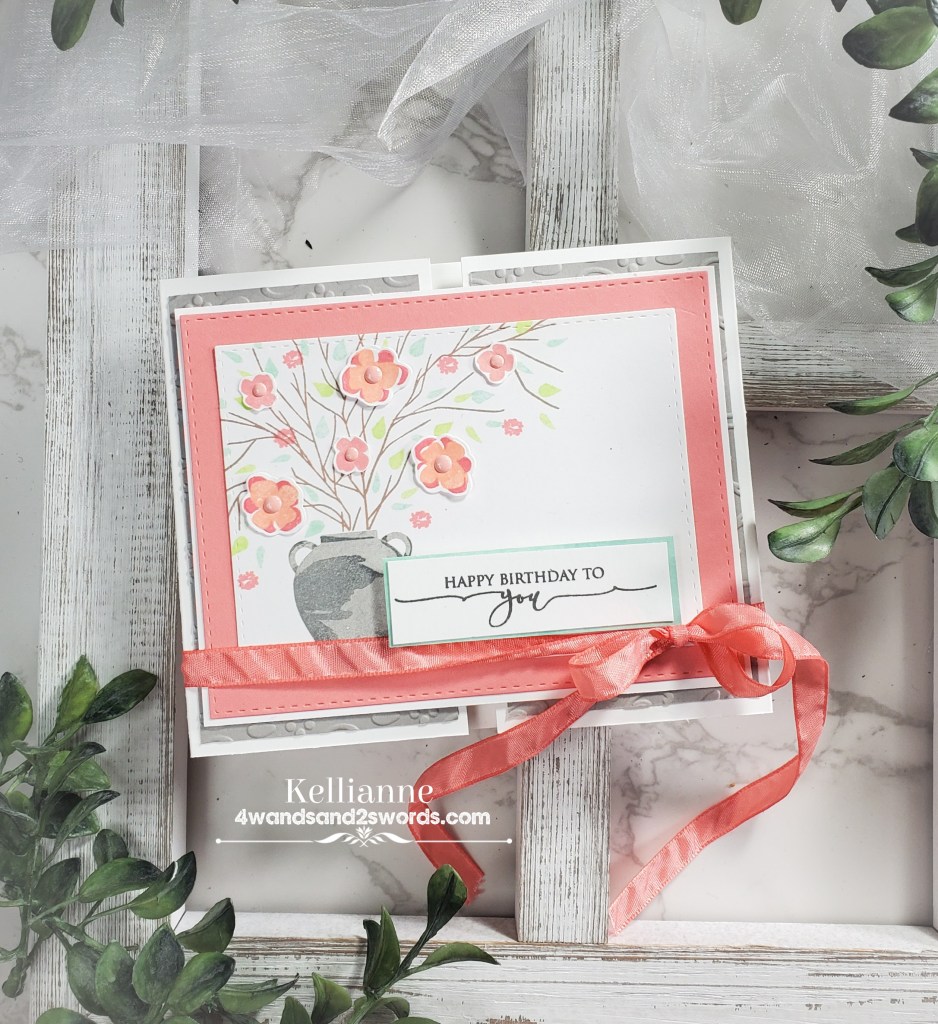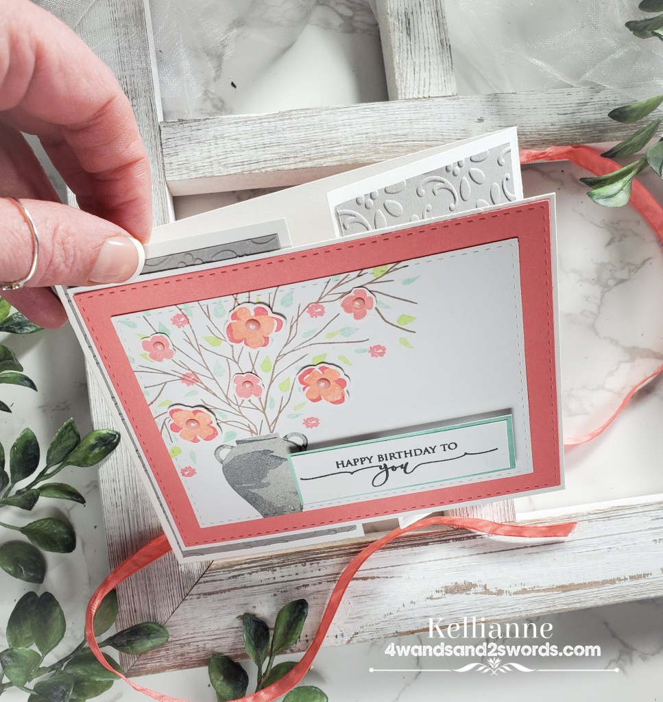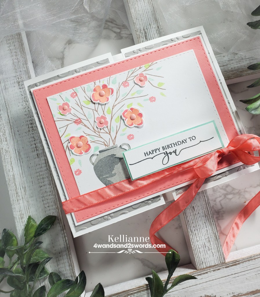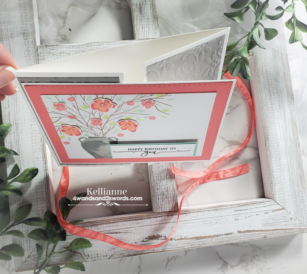 My Spring floral comes from a Papertrey Ink set and the sentiment is from a Gina K set. The pretty coordinating ribbon is a delicate touch to keep the gate folds closed and simply has to be untied for the recipient to look in the card and read a message