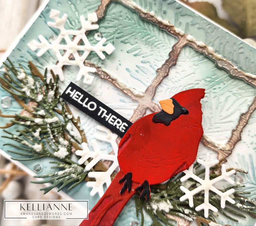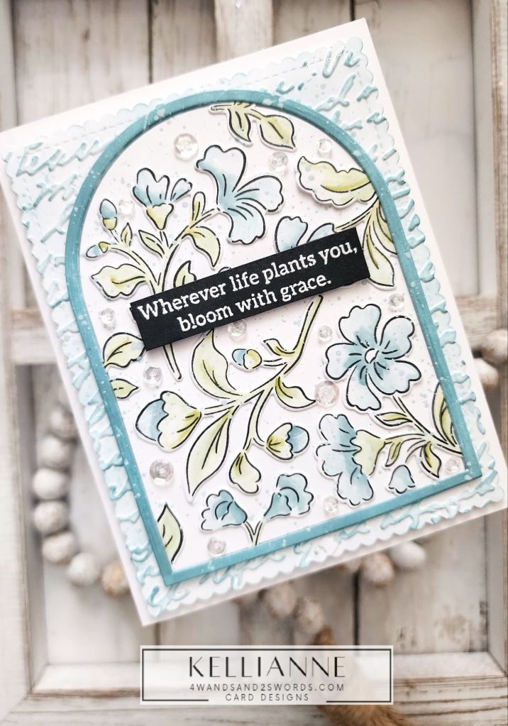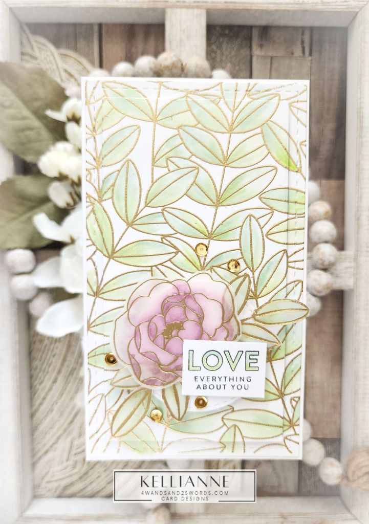 I used products by Simon Says Stamp for my card and made this pretty leaf background stamp my main focus for green