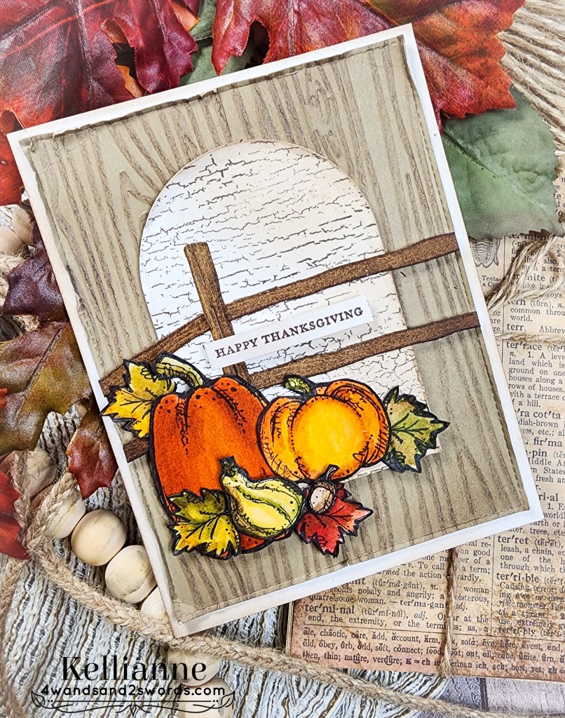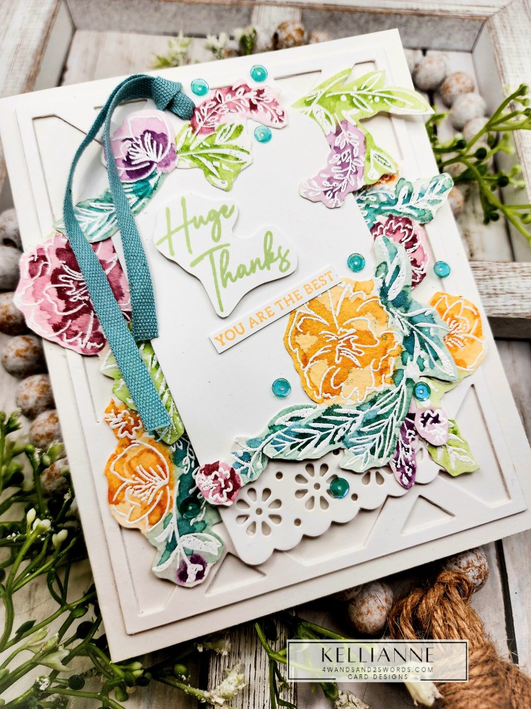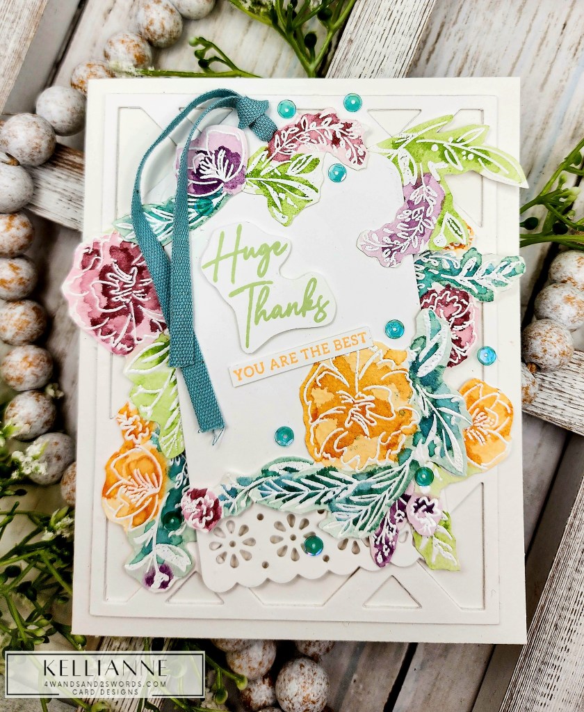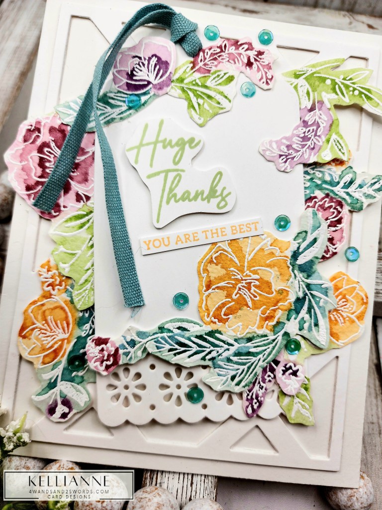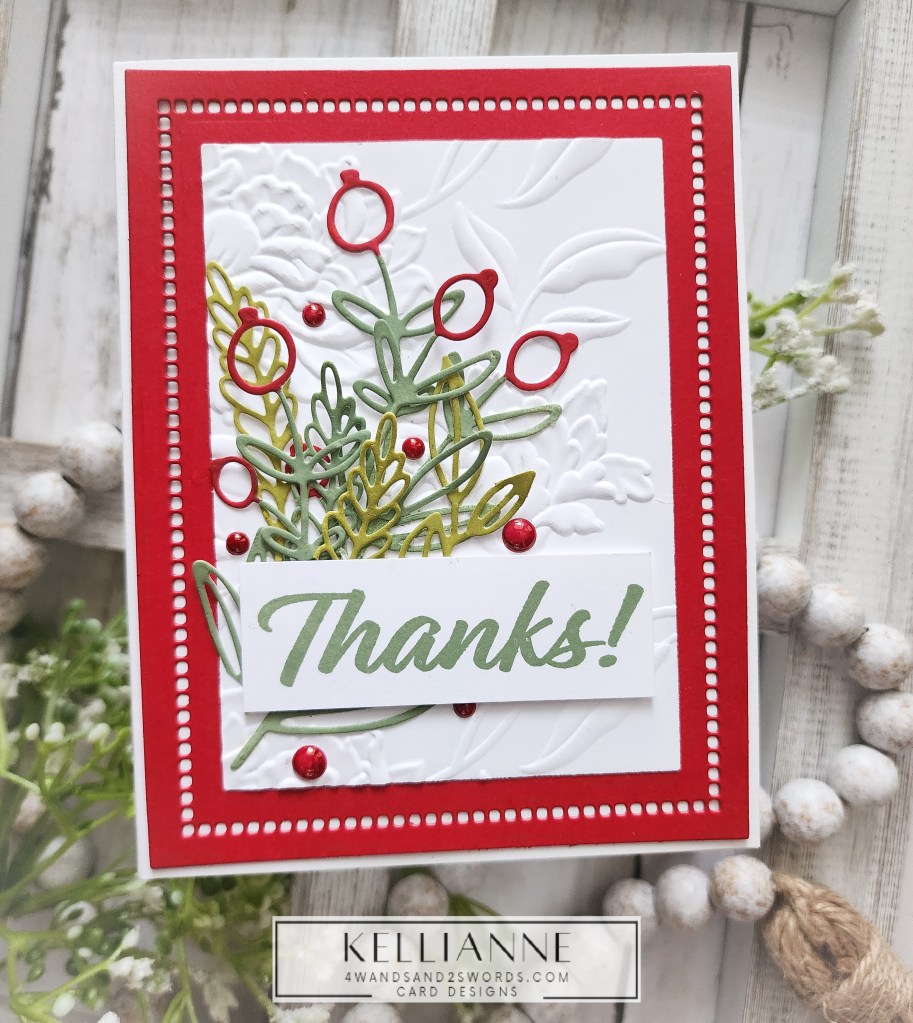 My leaves and foliage are from a die set called “Sprigs” by Scrapbook.com and the Thanks stamp is by them as well. I placed them all on a dry embossed panel that had a nice matte behind it, created with a Spellbinders border die.