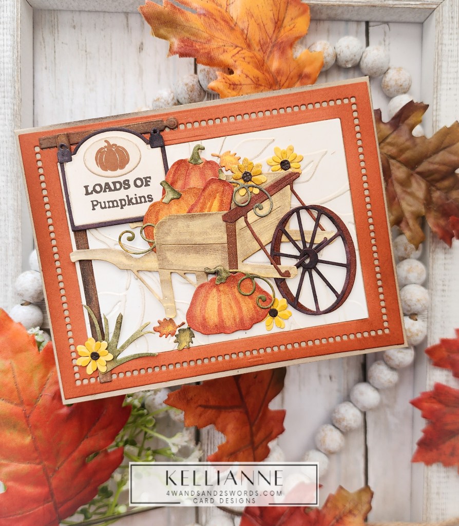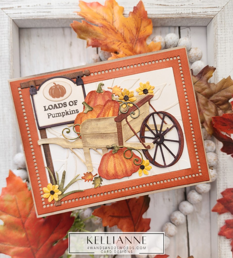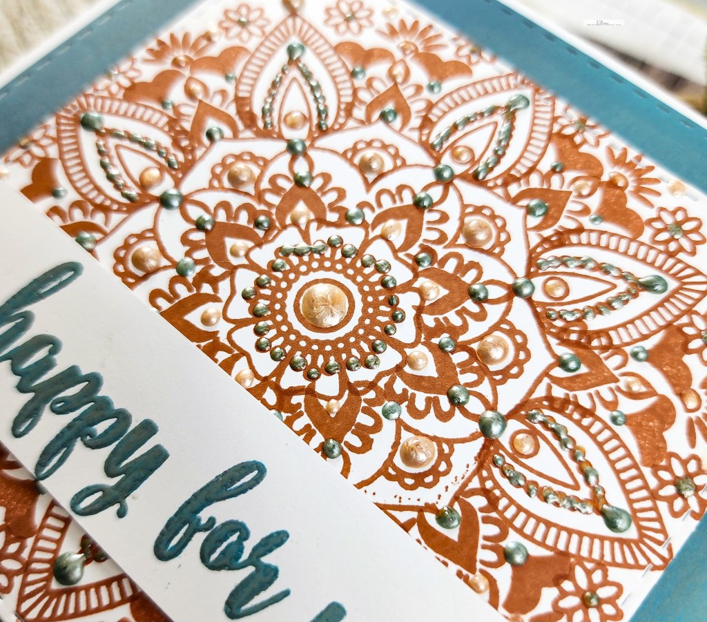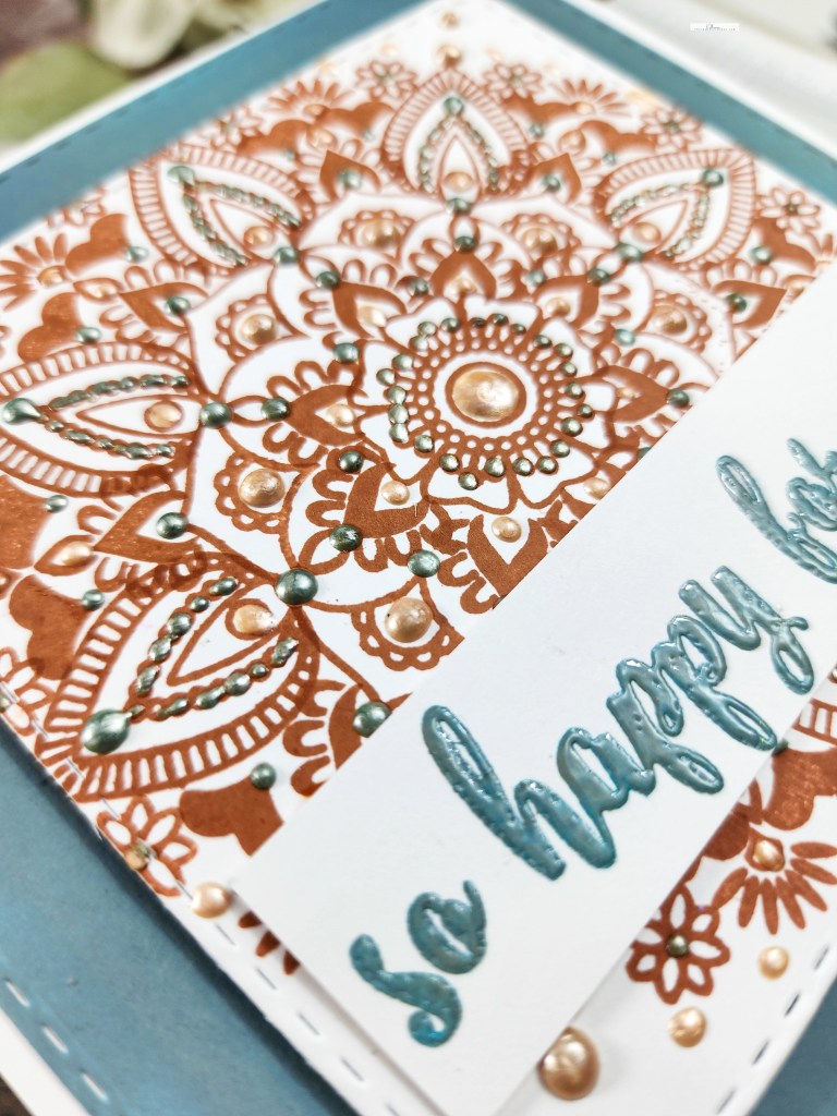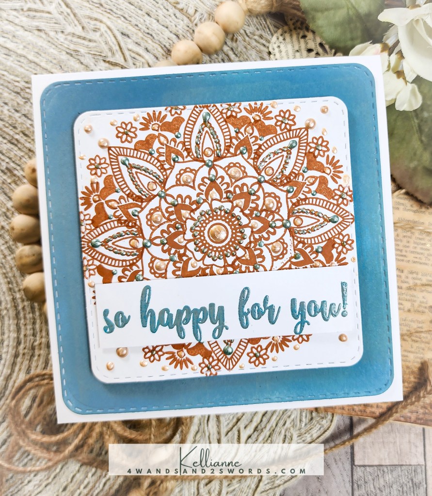 My leaves and foliage are from a die set called “Sprigs” by Scrapbook.com and the Thanks stamp is by them as well. I placed them all on a dry embossed panel that had a nice matte behind it, created with a Spellbinders border die.